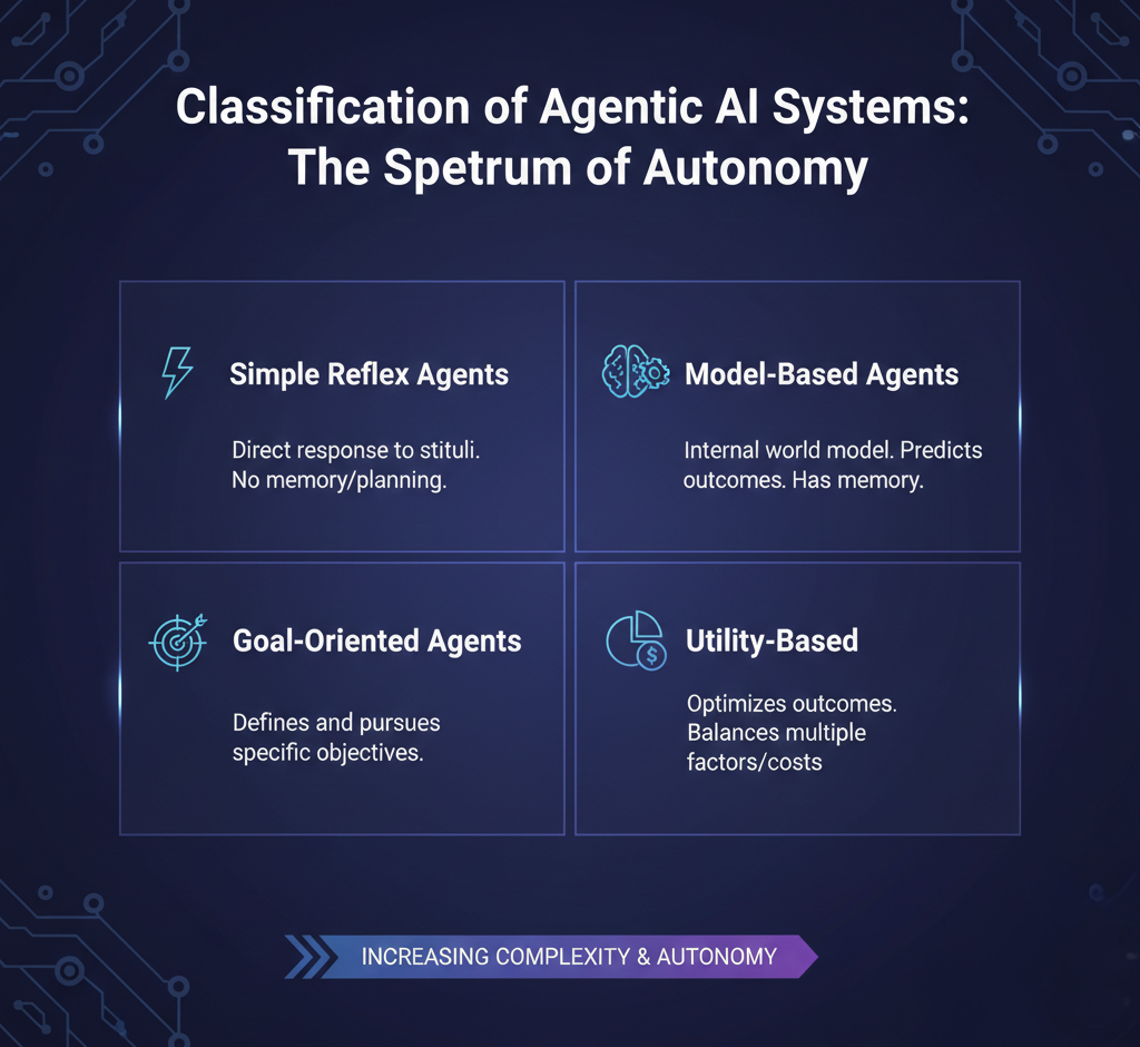 Not all agents are created equal. Depending on the complexity of your business logic, the anatomy of an agentic AI system can vary from a basic “if-then” engine to a sophisticated objective-driven machine. Understanding these categories is essential for AI development services to ensure the right architecture matches the right problem.
